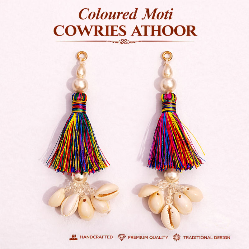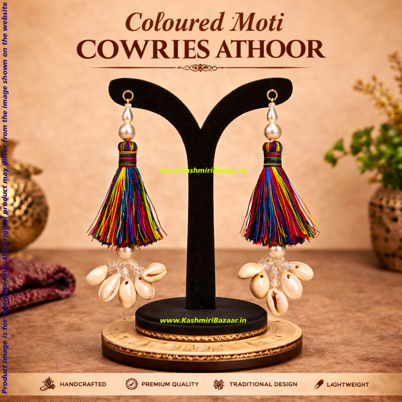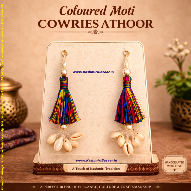 Traditionally worn by Kashmiri Pandit women during weddings, festivals, and special occasions, Athoor is a symbol of grace, tradition, and cultural pride. The colorful tassels combined with natural cowries create a striking and festive look, making it perfect for ethnic wear and celebrations.